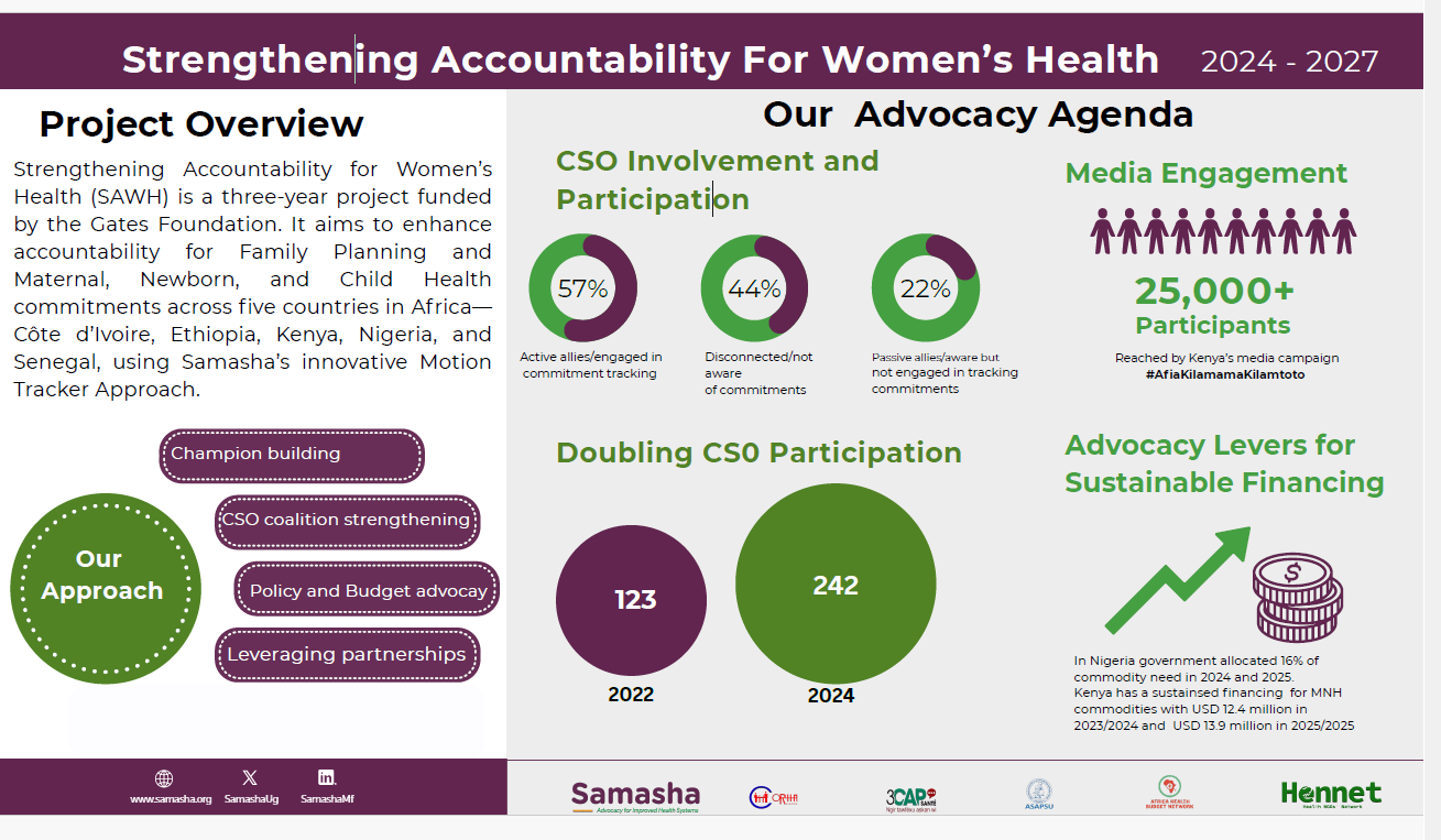 In addition, Samasha developed advocacy strategies that focused on capacity building and support for the country civil society advocacy for increased government transparency and commitments for family planning and supplies.